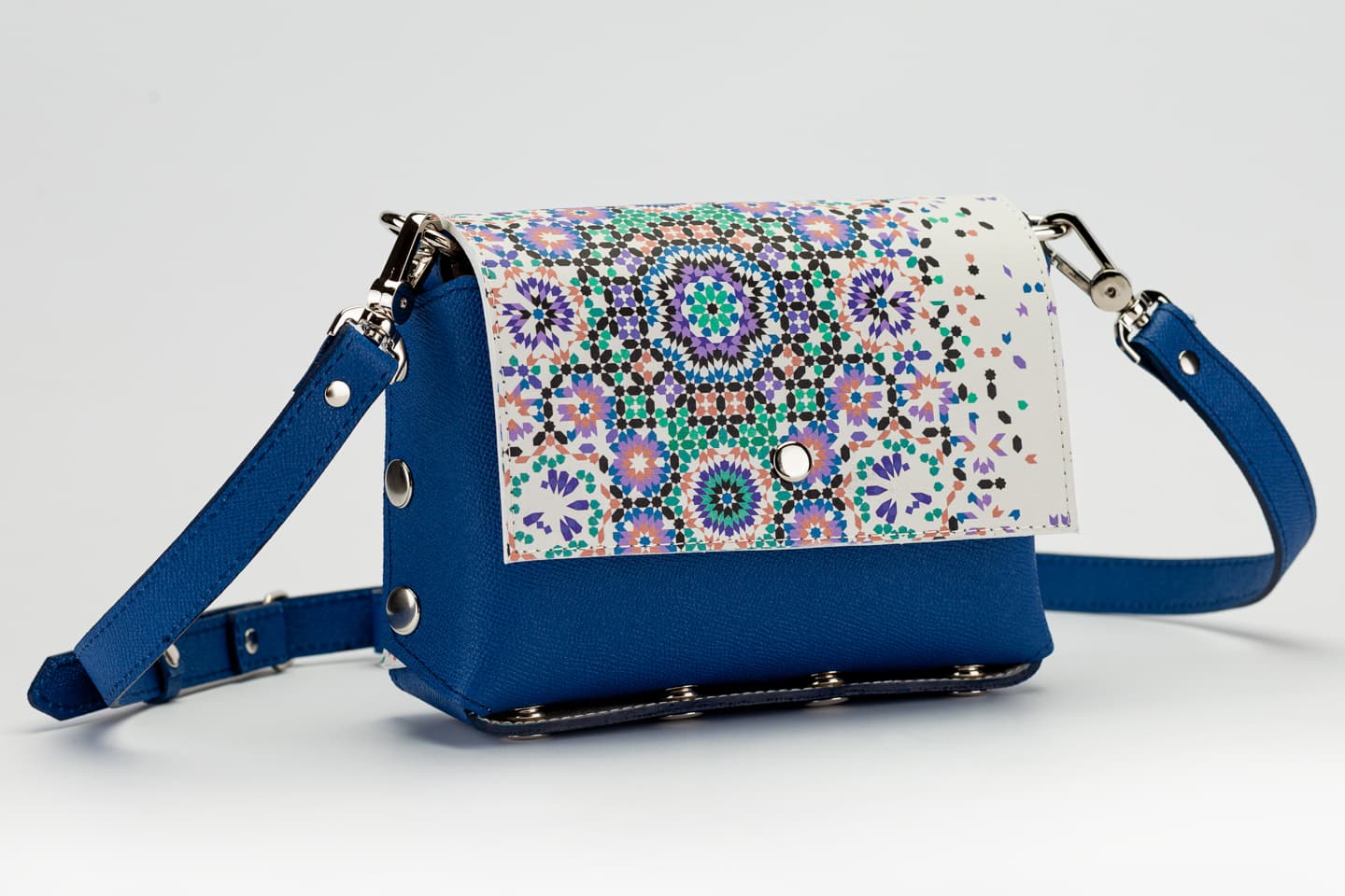 Лицевата част и дъното са изработени от висококачествена италианска кожа в син цвят.
