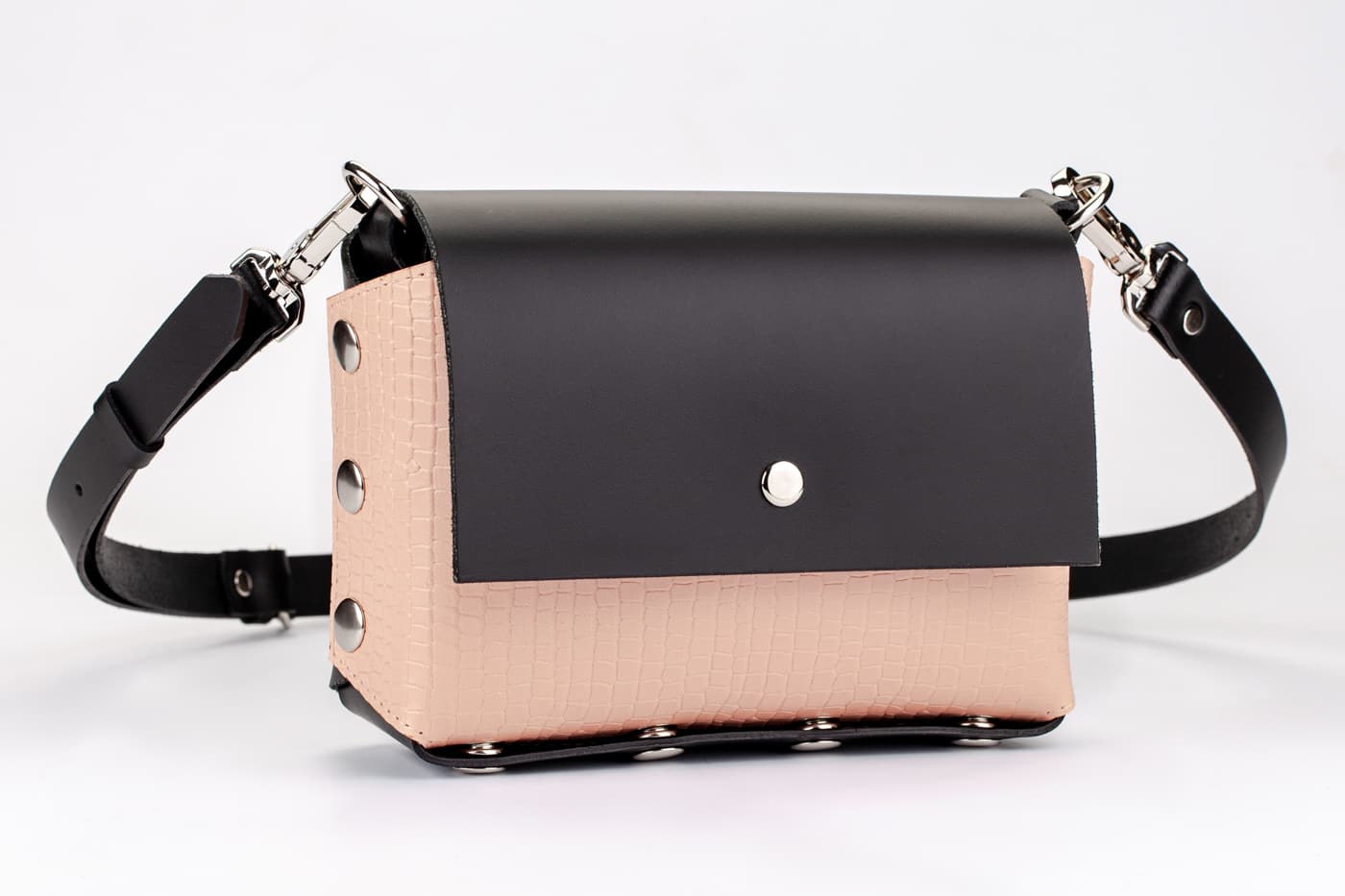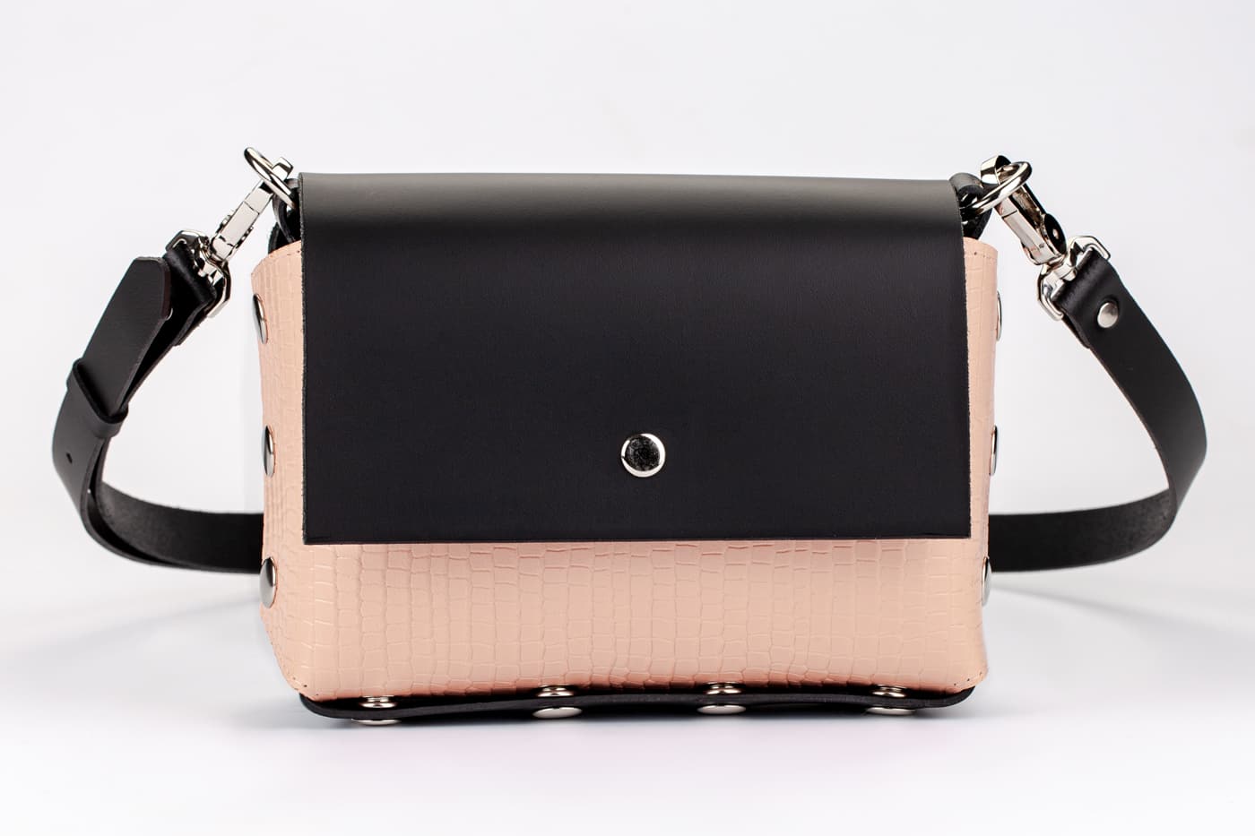 Модел Selin с лицева част от естествена кожа в кроко принт в розово.