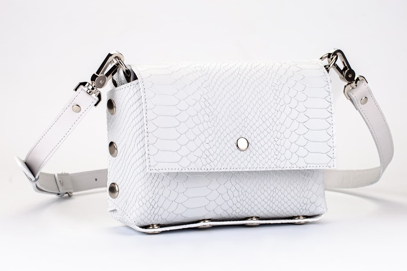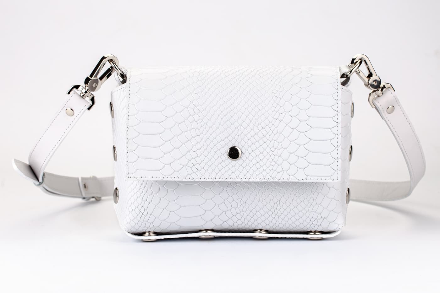 Модел Selin с капак от естествена кожа в в кроко принт в бяло.