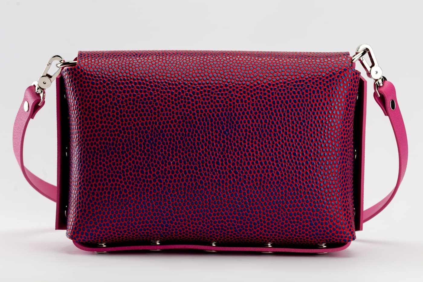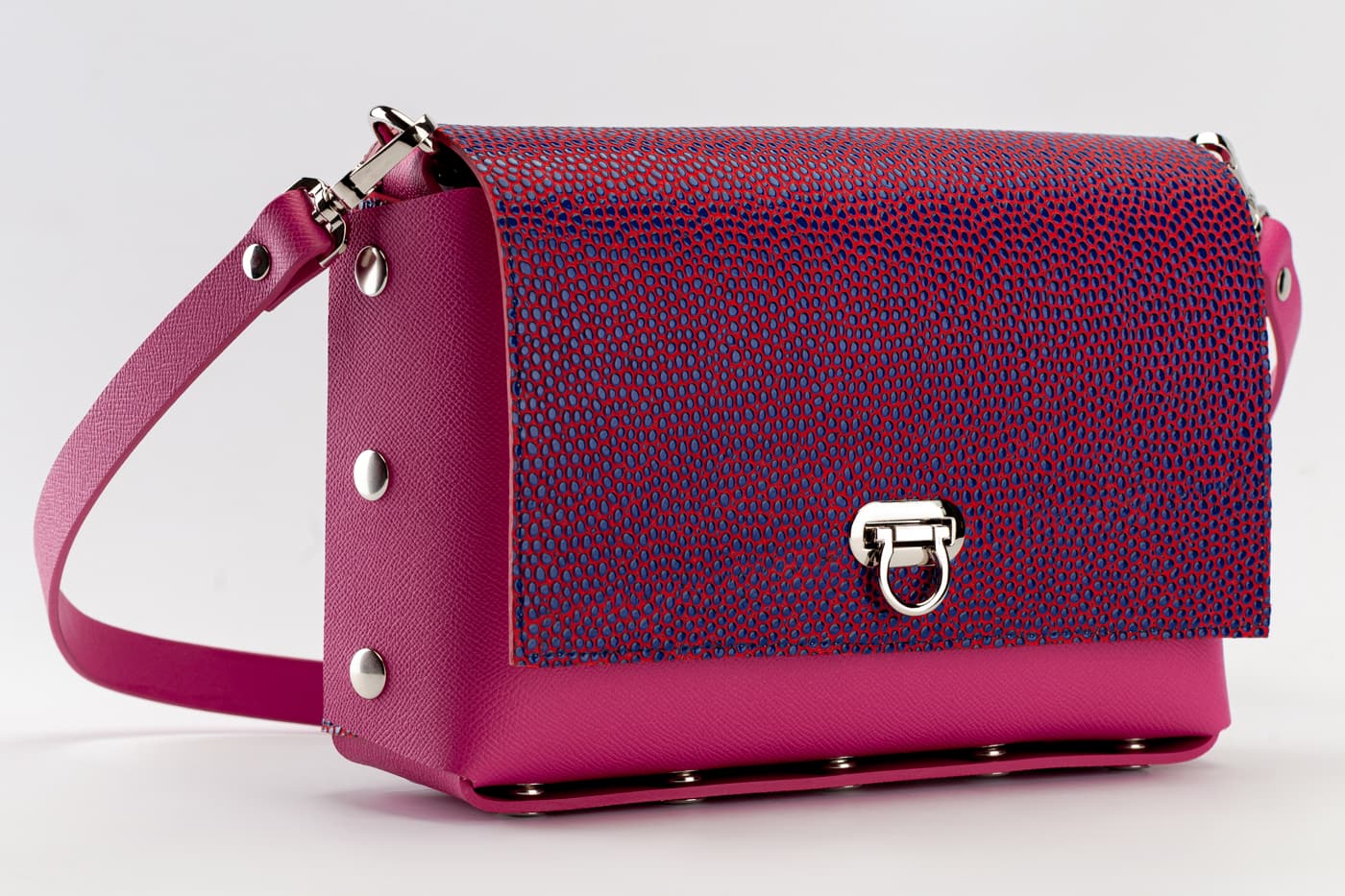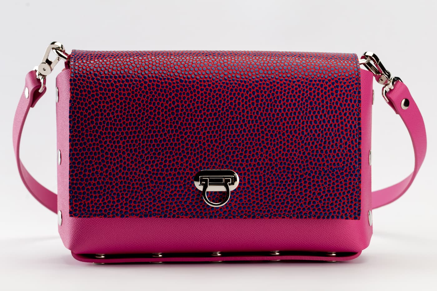Лицевата част и дъното са изработени от висококачествена италианска кожа в тъмно розов цвят.