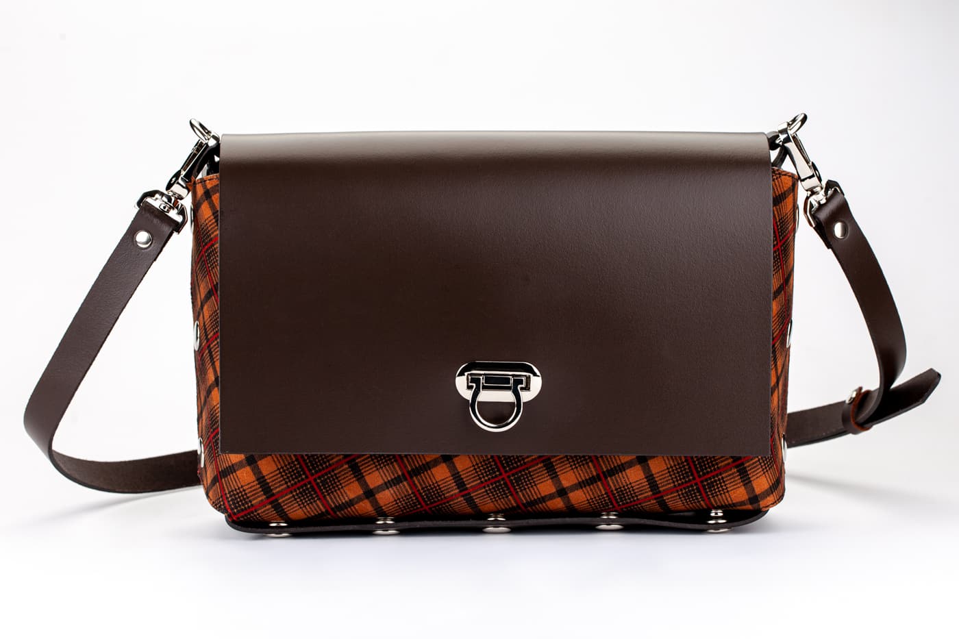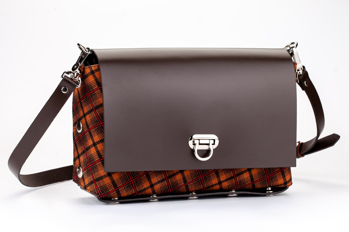 Модел Valena с лицева част от естествена кожа в цвят кафяво каре.